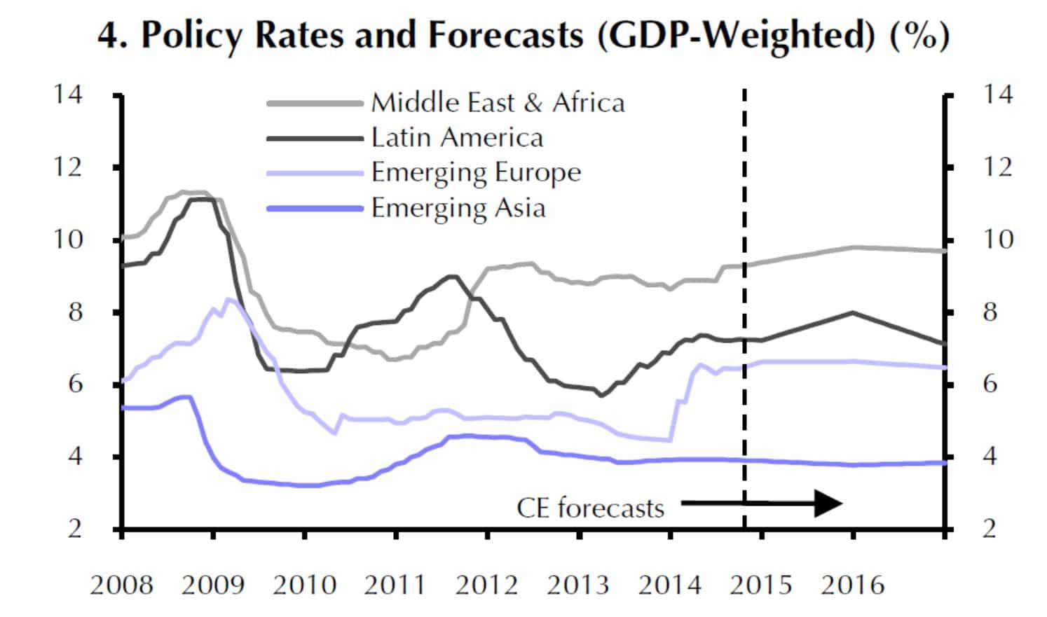 Die Leitzinsen („Policy Rates“) werden gemäß der Einschätzung des Londoner Research-Instituts Capital Economics bis 2016 weitgehend unverändert bleiben. Nur für Lateinamerika erwartet CE Ende 2015 eine leichte Reduzierung von derzeit acht auf dann sieben Prozent.