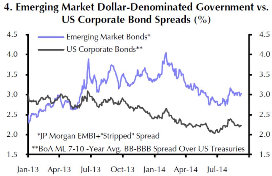 Die Spreads der EM USD-Staatsanleihen bewegen sich fast im Gleichlauf zu den USD-Anleihen von Unternehmen mit vergleichbarem Rating