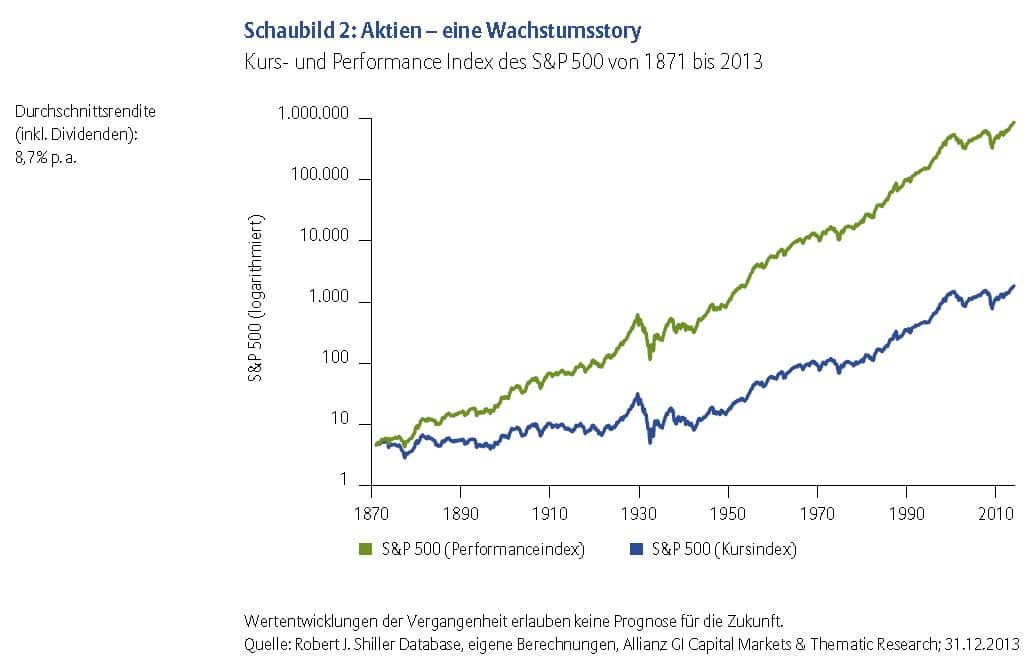 Die seit 1870 verfügbare Statistik über die Entwicklung der Unternehmenswerte im amerikanischen S&P 500 weist von 1870 bis 2013 eine Gesamtrendite aus Kursgewinnen und Dividendenerträgen von durchschnittlich 8,7 % jährlich aus. Die Staatsverschuldung können wir als Einzelpersonen nicht beeinflussen, den persönlichen Vermögensmix aber schon. So bleibt uns doch noch eine Möglichkeit, der schleichenden Enteignung unserer Geldvermögen entgegenzutreten.