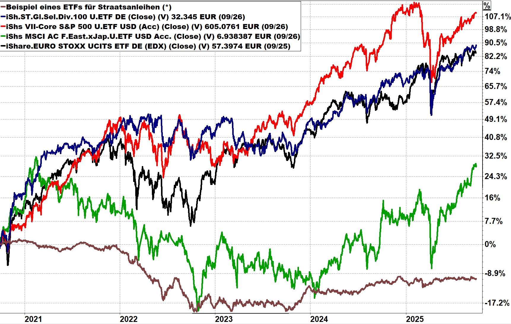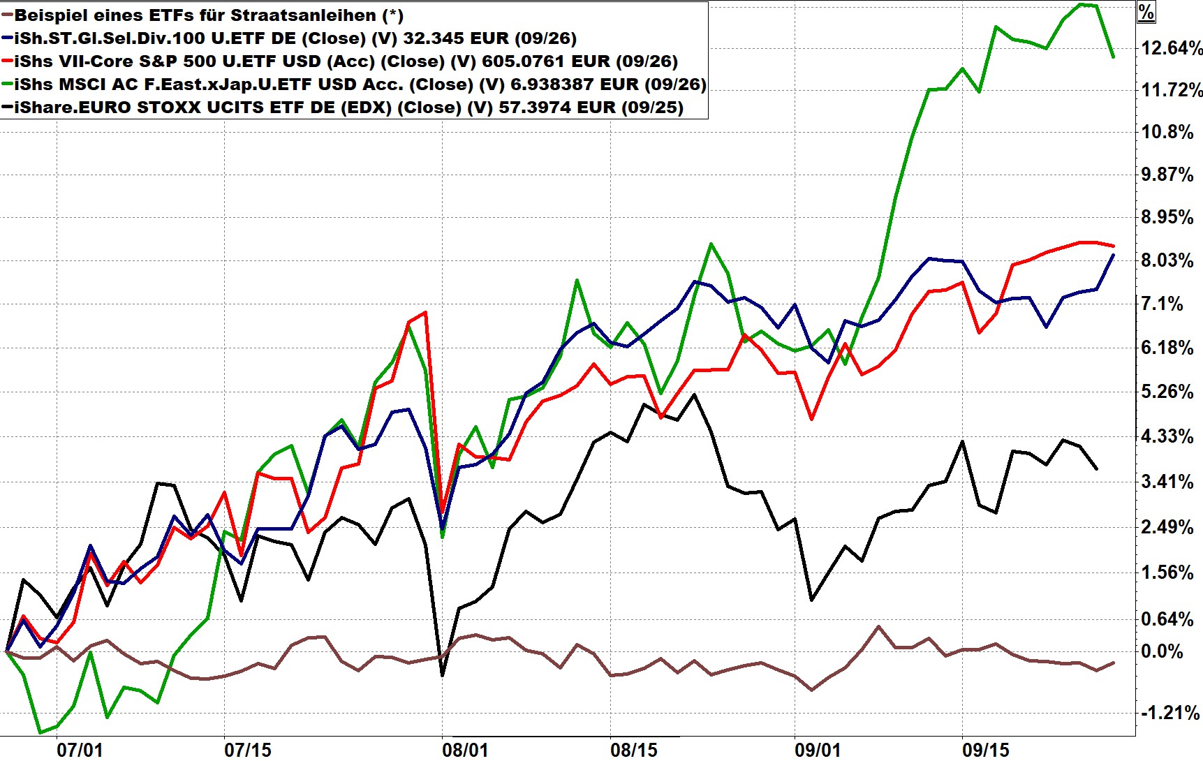 Die folgende Grafik zeigt die Entwicklung von vier Aktien-ETFs und einem Anleihen-ETF während der letzten drei Monate bis zum 28.09.2025.