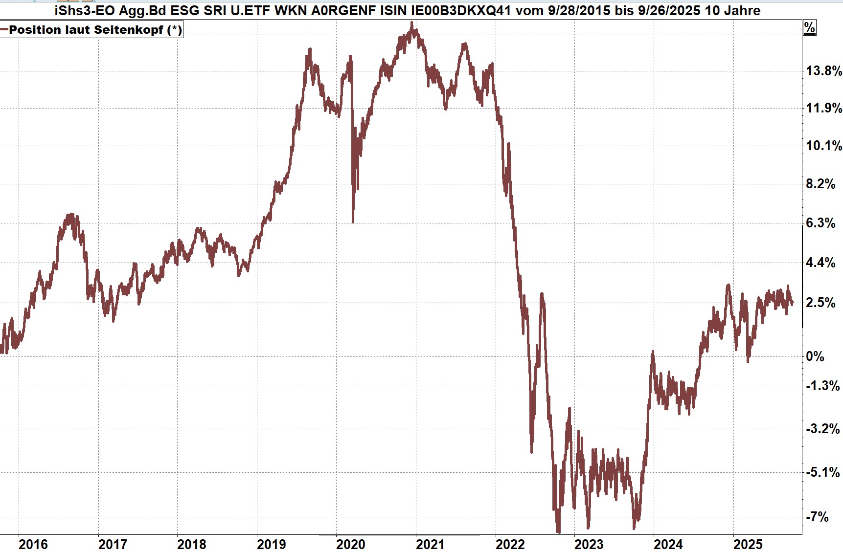 Auch der vielzitierte Hinweis, dass Anleihen geringere Schwankungen aufweisen und deswegen gemäß der gängigen Interpretation von Schwankungen „sicher“ sind, hat sich nicht bestätigt. Betrachten Sie den Rückgang von über 20 % von Anfang 2022 bis Ende 2023 – und dies mit einer Gesamt-Rendite von 2,5 % in zehn Jahren.