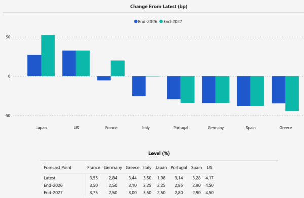 Grafik: Prognose zur Veränderung des Zinsniveaus von 10-jährigen Staatsanleihen bis Ende 2026 (blau) und Ende 2027 (grün)