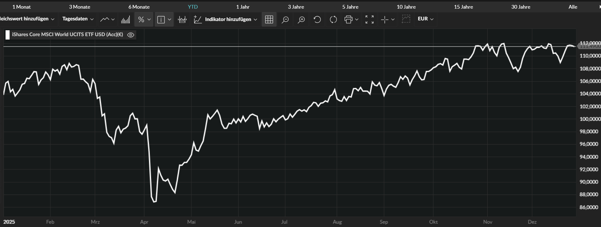 Grafik: iShares Core MSCI World ETF im Jahr 2025, bewertet in Euro