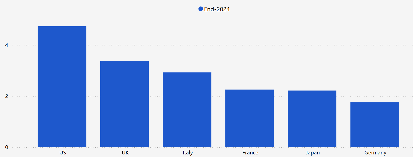 Capital Economics (CE), ein internationaler unabhängiger Analysedienst, erwartet die beste Börsen-Entwicklung in der Gruppe der Industrieländern weiterhin in den USA. Bis zum Jahresende 2024 wird der S&P 500 bei etwa 6.000 erwartet. Ausgehend vom Stand der Grafik per 11.10.2024 entspricht dies etwas mehr als 4 %, wovon bis zum 30.10. schon 1 % zurückgelegt sind. Damit verbleiben gemäß dieser Prognose bis zum Jahresende noch ein Potential von 3 %. Die anderen großen Industrieländer (UK, Italien, Frankreich, Japan und als Schlusslicht Deutschland) bleiben dagegen zurück.