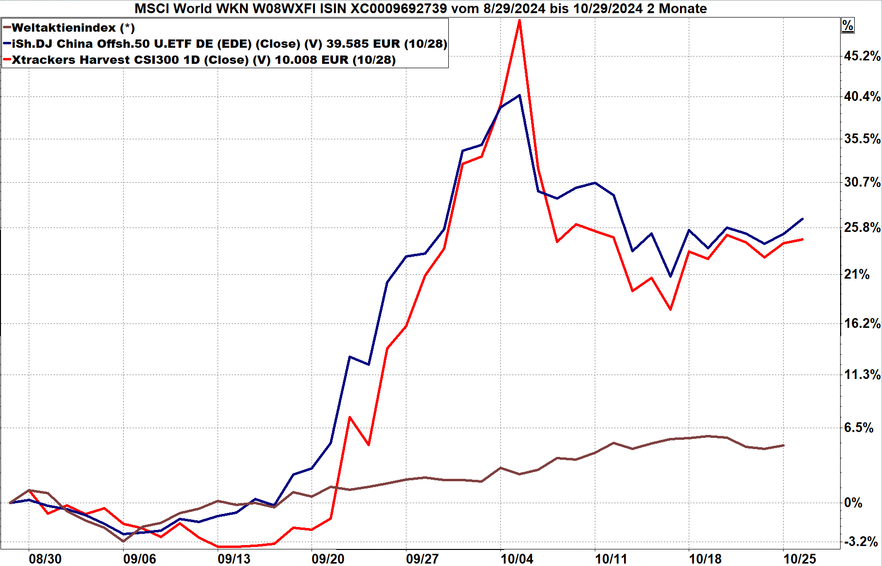 Die Kurse der Börsen in China erlebten jüngst nach sehr langer Durststrecke eine starke Aufwärtsbewegung. Auslöser waren Ankündigungen der Regierung, mit einem umfangreichen Programm diverse Probleme im Land beheben zu wollen. Nach dem schnellen Anstieg folgte sofort wieder ein Rückgang. Die Kurse des CSI300 (dreihundert größte Inlandsunternehmen) und des DJ China Offshore 50 (50 größte über Hong Kong international gehandelte Aktien) stehen per 29.10.24 etwa 25 % höher als vor dem Ausbruch nach oben.