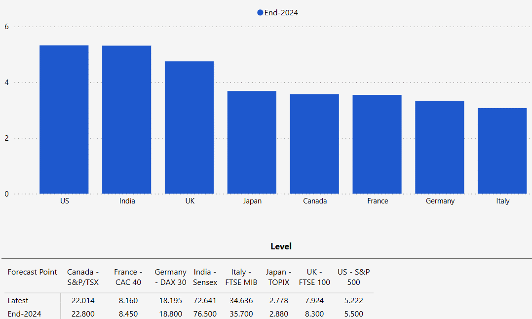Auch für die kommenden neun Monate erwartet Capital Economics eine Steigerung der Aktienkurse. Hier eine Auswahl von acht Ländern mit den Prognosen, wie stark die Aktienmärkte in diesen Ländern bis zum Jahresende zulegen könnten.