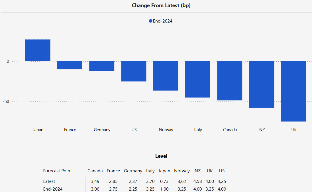 Eine weiterhin zurückgehende Inflationsrate und eine Reduzierung der Leitzinsen wird auch die langfristigen Zinsen etwas nach unten bringen. Hier die Prognosen von Capital Economics, dem internationalen Analysedienst, für die wichtigsten Industrieländer. Die Grafik zeigt, um wievielt Basispunkte (bp) die Zehnjahres-Zinsen per Ende 2024 tiefer erwartet werden als per 23.03.2024. Hundert bp entsprechen einem Prozentpunkt.