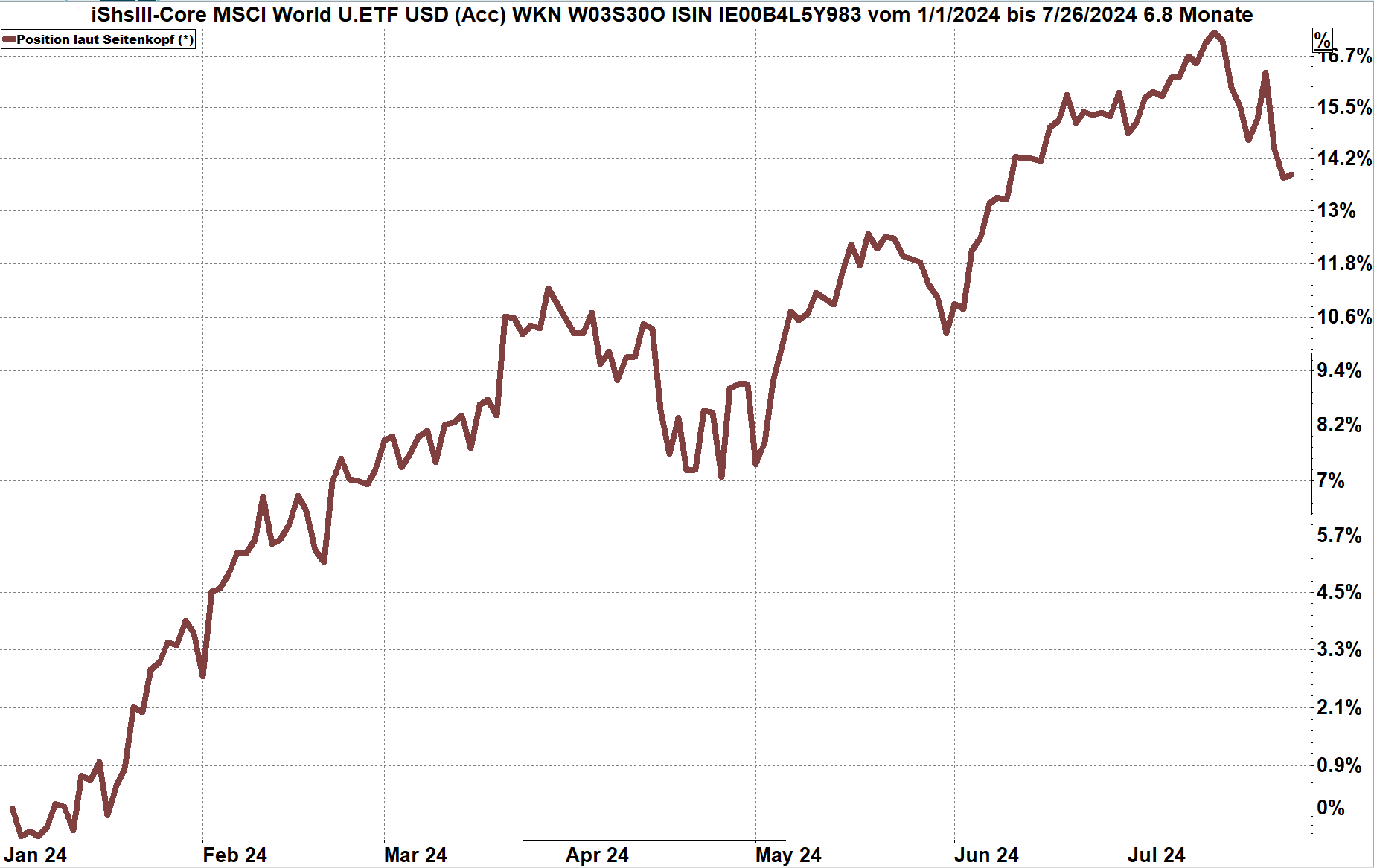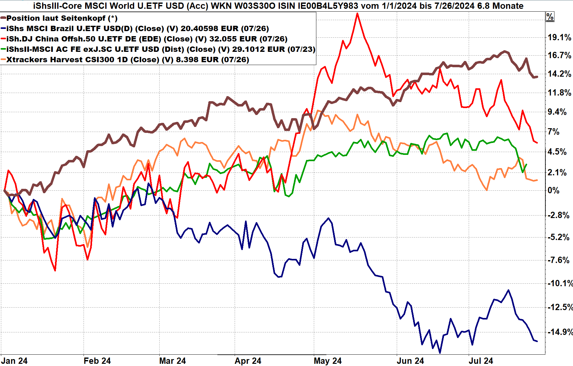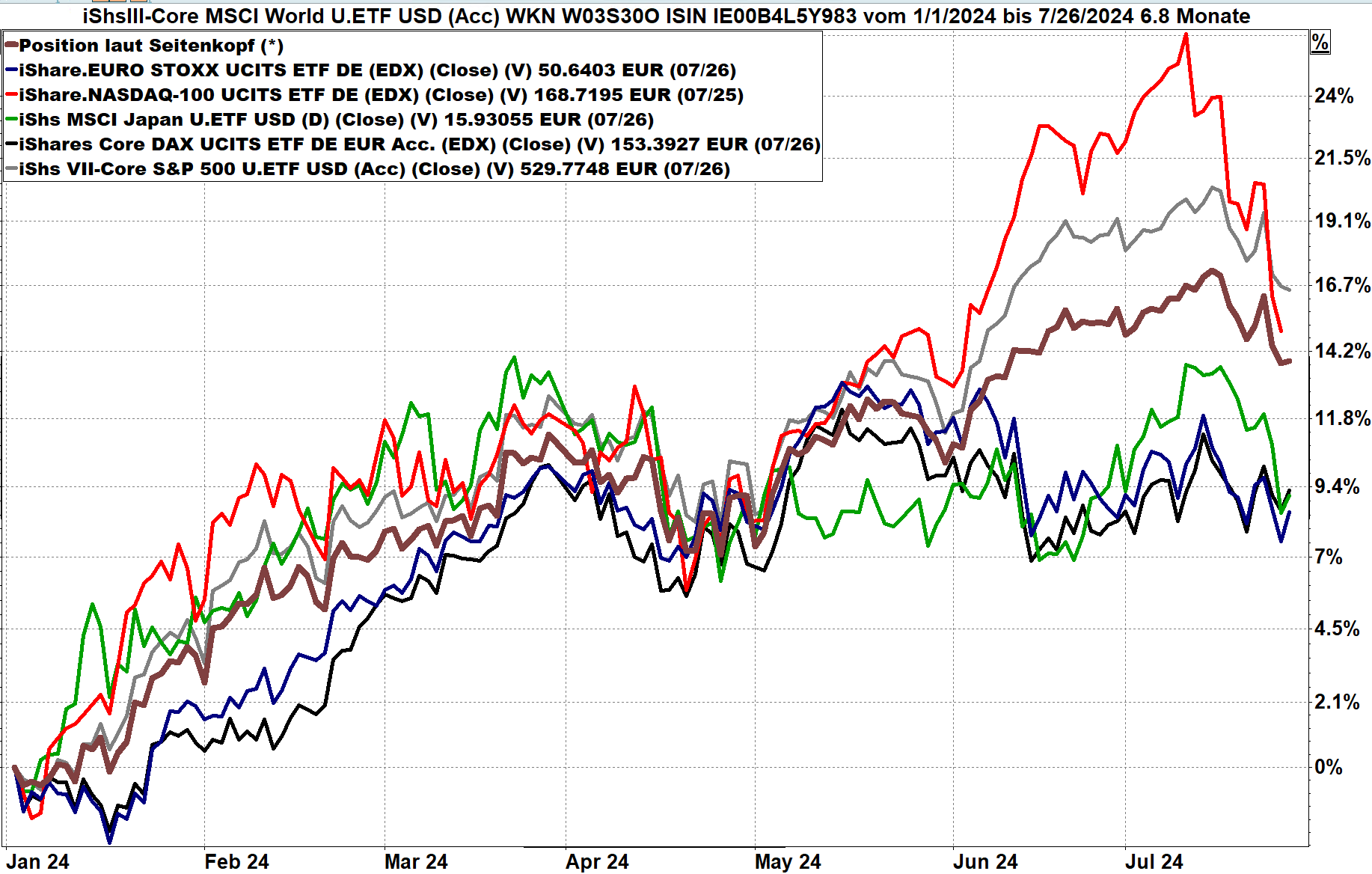 Die folgende Grafik zeigt einen iShares ETF auf den Weltaktienindex von Anfang 2024 bis 26.07.2024, Bewertung aus Sicht eines Euro-Anlegers.