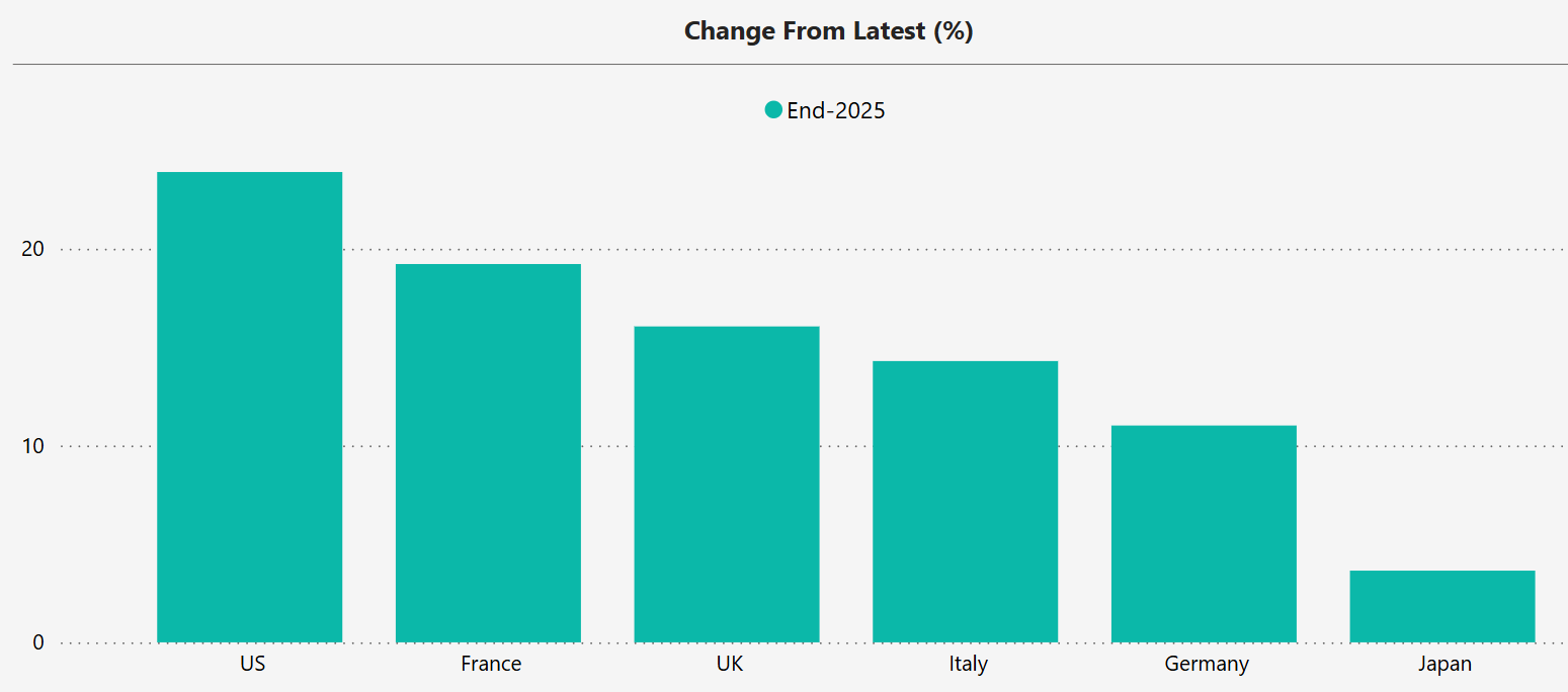 Bis Ende 2025 erwartet Capital Economics eine weitere Steigerung der Börsenkurse, für die USA (ausgehend vom 12.07.2024) von über 20 %. Die europäischen Staaten liegen etwas darunter, wobei Deutschland mit ca. 11 % das Schlusslicht markiert.