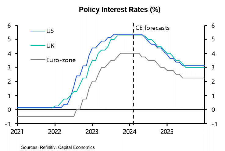 Die Inflation wird im Laufe des Jahres 2024 sowohl in den USA als auch in der Eurozone weiter zurückgehen, wenn auch – vor allem in den USA – langsamer als vorher erwartet. Die Notenbanken (UK und US) werden die Leitzinsen bis zur Jahresmitte 2025 stufenweise auf 3 % senken, in der Eurozone bis auf knapp über 2 %.