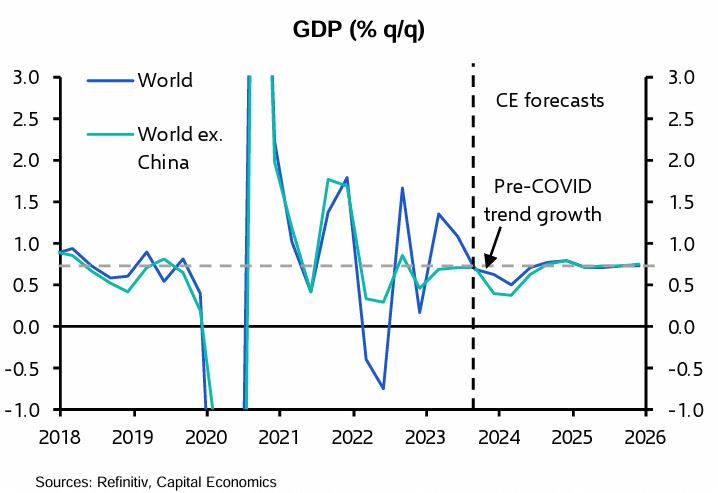 Im Zentrum der Aufmerksamkeit stehen jetzt wieder die Entwicklung des Wirtschaftwachstums. Investoren möchten an Unternehmen beteiligt sein, deren Umsätze und Gewinne wachsen. Für die nächsten Monate erwartet Capital Economics (CE) eine leichte Abschwächung des Wirtschaftswachstums. Für das zweite Halbjahr jedoch wird das Wirtschaftswachstum in den Industrieländern wieder auf den Wert des Trend-Wachstums vor Ausbruch der Covid-Pandemie zurückkehren.