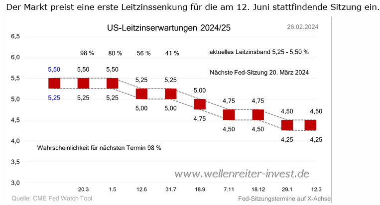 Gemäß dem Fed-Watch-Tool, veröffentlicht von Wellenreiter Invest, wird die erste Zinssenkung nicht mehr per März, sondern erst per Juni 2024 erwartet. Diese Verschiebung scheint die Investoren jetzt nicht mehr zu beunruhigen.