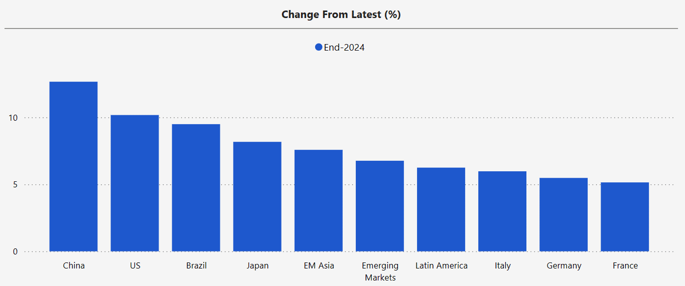 Capital Economics erwartet für alle Märkte per Jahresende 2024 höhere Börsenkurse als derzeit. Die folgende Grafik zeigt die erwartete Veränderung ausgewählter Märkte, ausgehend vom Stand per 19.04.2024.