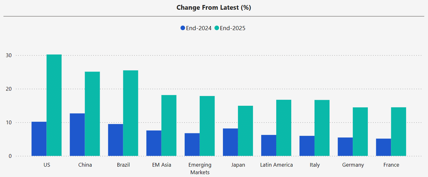 Erweitern wir den Prognosezeitraum bis Ende 2025, sieht das Bild für zahlreiche Börsen noch positiver aus. Die US-Börsen werden gemäß Einschätzung von Capital Economics Ende 2025 um 30 % höher stehen als am 19.04.2024.