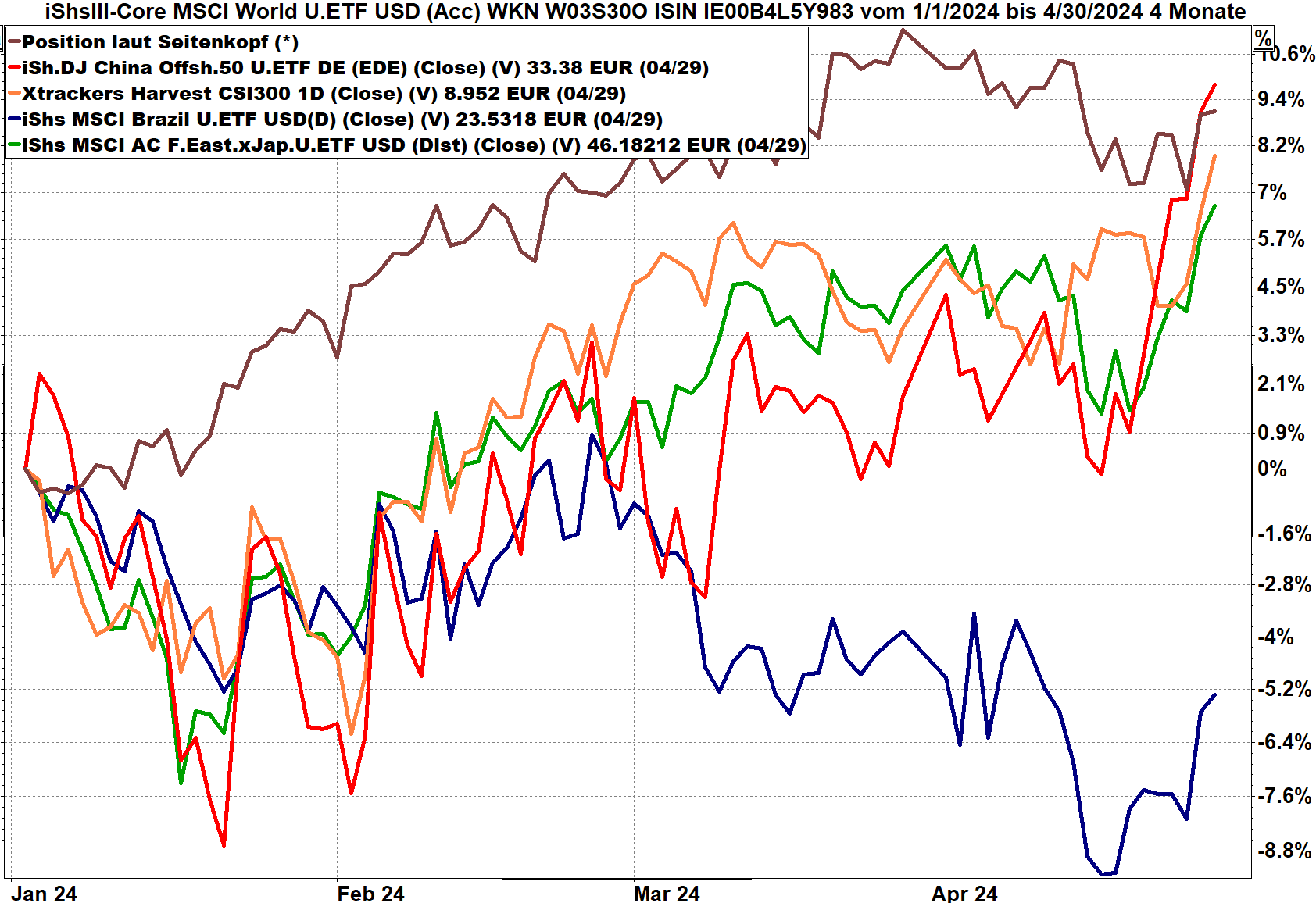 Die Börsenkurse der Schwellenländer folgen allerdings – manchmal sogar über lange Zeiträume – einer anderen Dynamik. Die folgende Grafik zeigt einige Positionen mit ihrer Entwicklung seit Jahresbeginn 2024.