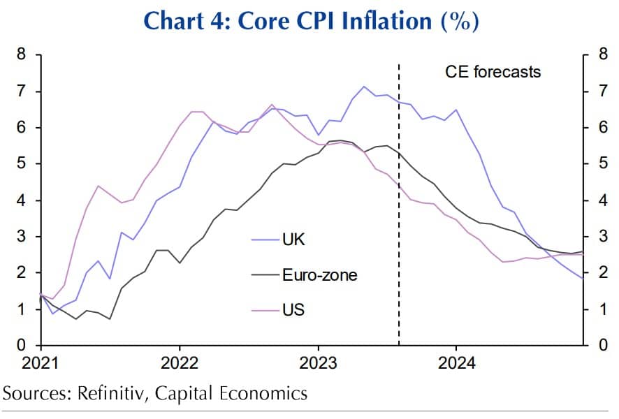 Capital Economics (CE) rechnet damit, dass bis zum Jahresende sowohl in den USA als auch in der Eurozone ein Rückgang der Inflationsrate stattfinden und sich diese Entwicklung in 2024 beschleunigen wird. Bis Ende 2024 würden die Inflationsraten in beiden Wirtschaftsräumen unter 3 % liegen.