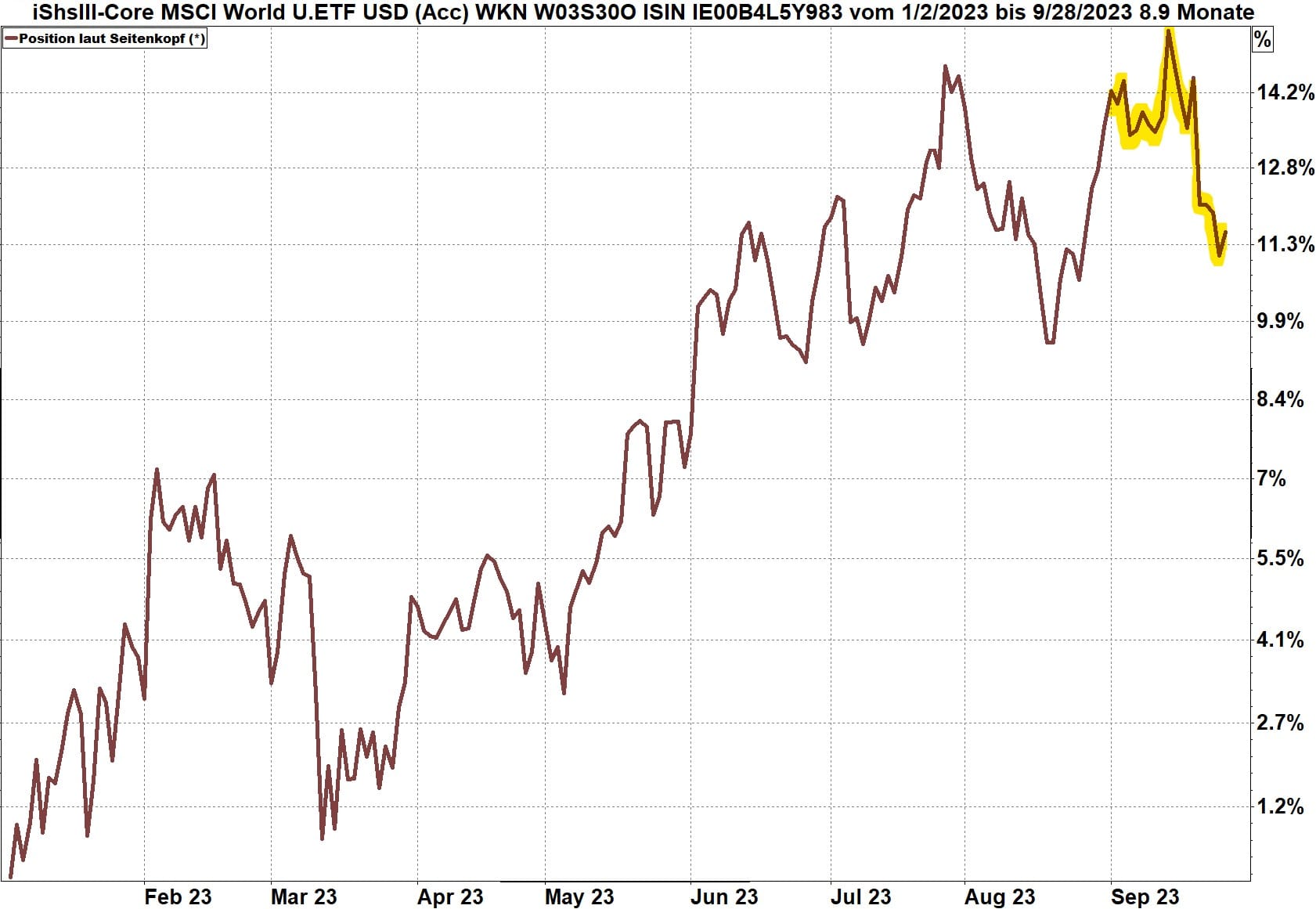 Im September erzielten die Aktienmärkte (in der folgenden Grafik am Beispiel des Weltaktienindex, in Euro bewertet) zunächst einen weiteren Wertzuwachs. Zur Monatsmitte begann jedoch ein Kursrückgang, so dass der September 2023 insgesamt mit einem Wertrückgang von zwei Prozent aus dem Rennen ging.
