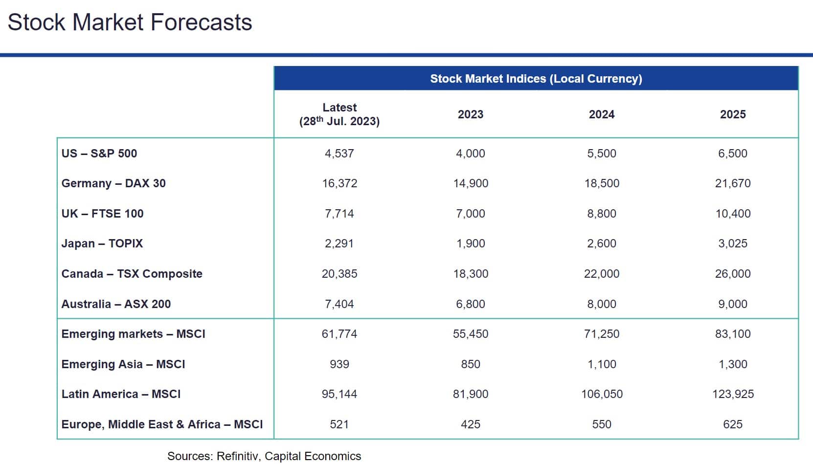 Capital Economics (CE) erwartet für alle Aktienmärkte ab 2024 wieder ein sehr starkes Wachstum, das den S&P 500 bis Ende 2025 auf 6.500 und den DAX auf 21.670 führen könnte. Auch wenn diese Prognose vom 28. Juli 2023 nicht ganz erreicht würde, so deutet das Ergebnis der tiefen Recherche von CE doch an, dass wir als Langfrist-Investoren mit Zuversicht auf die weitere Entwicklung der Weltwirtschaft sehen können.