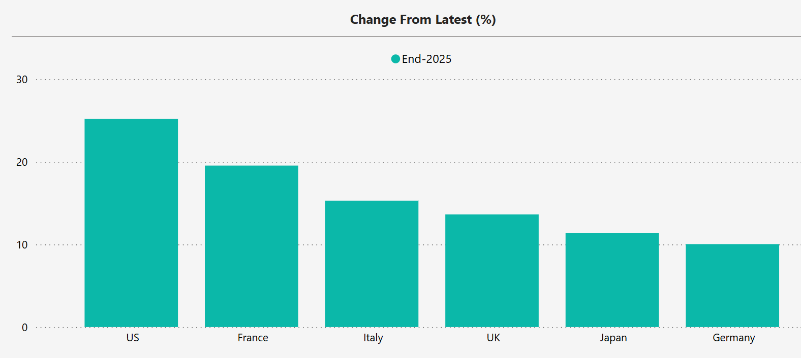Bis Ende 2025 erwartet Capital Economics vor allem in den USA eine weitere Aufwärtsbewegung. Auch für diesen Zeitraum markieren die deutschen Börsen das Schlusslicht.