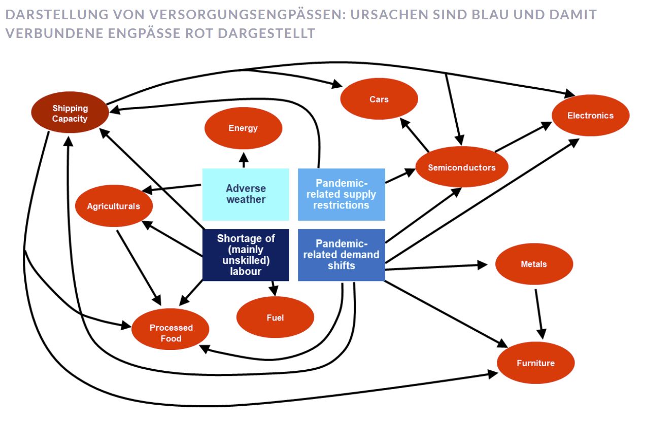 Die wirtschaftliche Entwicklung in allen Industrieländern wird weiterhin durch fehlende Teile behindert. Die folgende Grafik illustriert Zusammenhänge zwischen Ursache und Wirkung. Die blauen Rechtecke nennen einige Ursachen, die roten Ovale die sich daraus ergebenden Folgen.