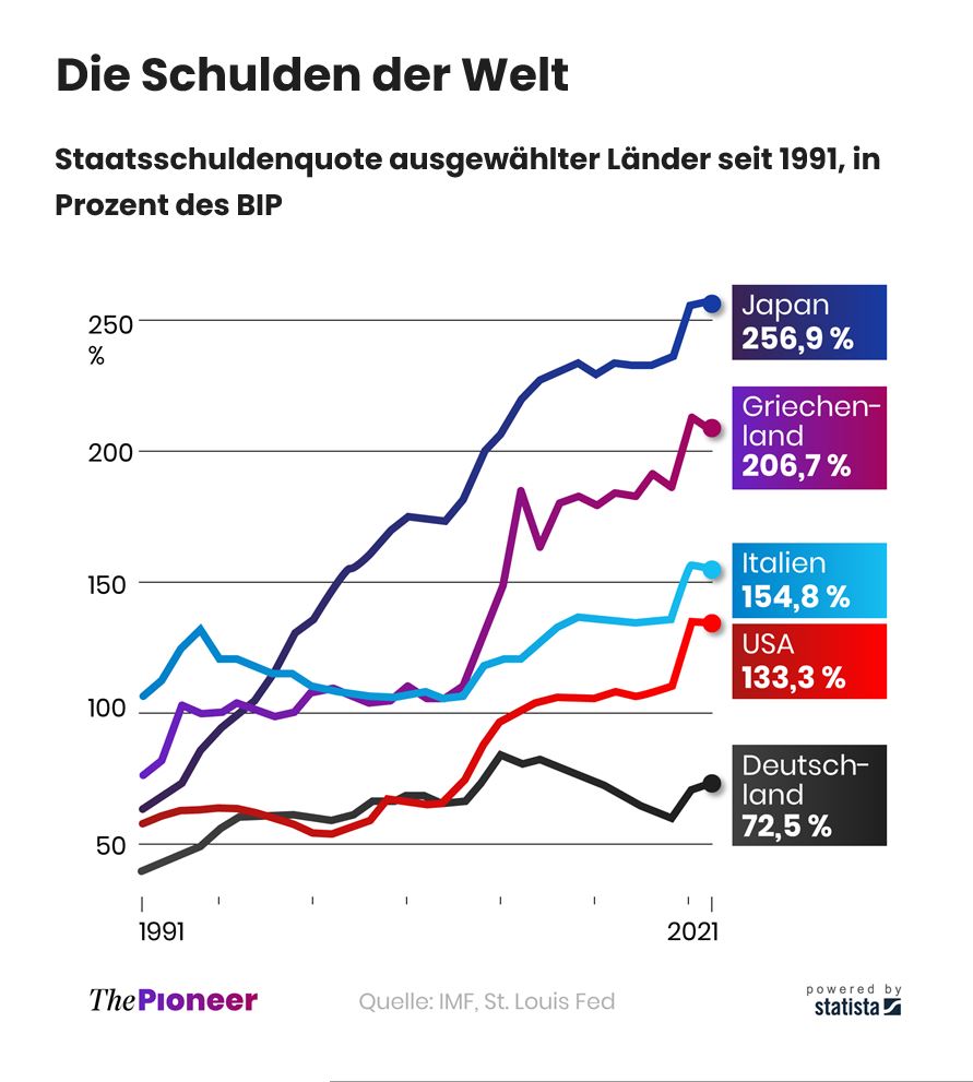 Fast alle Staaten dieser Welt haben in den letzten Jahren ihren Schuldenstand erhöht. Dies war mit Ausnahme von Deutschland bereits vor Ausbruch der Corona-Pandemie so. Seit Beginn der Pandemie sind die Staatsschulden mit beschleunigtem Tempo gestiegen.
