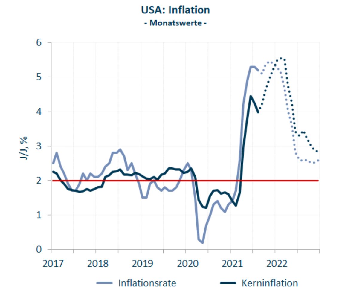 Capital Economics (CE), ein unabhängiger Analysedienst, erwartet (Stand 27.10.2021) für die USA eine Entwicklung der Inflationsrate wie folgt: