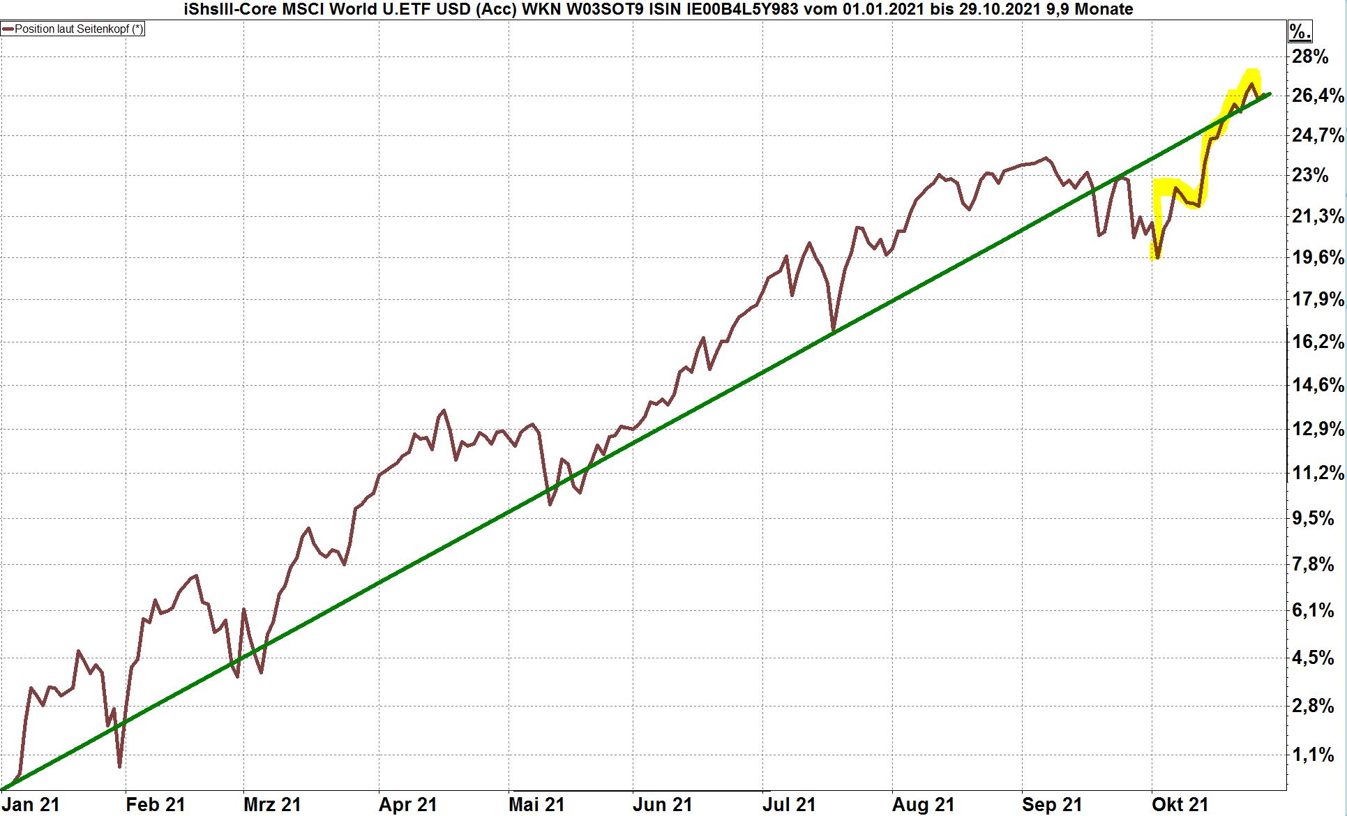 Chart: Der Weltaktienindex, hier dargestellt über den iShares ETF auf den Weltaktienindex, seit Jahresbeginn bis zum 29.10.2021. Ins Auge fallend: Der Rückgang im September und die schnelle Aufwärtsbewegung im Oktober.