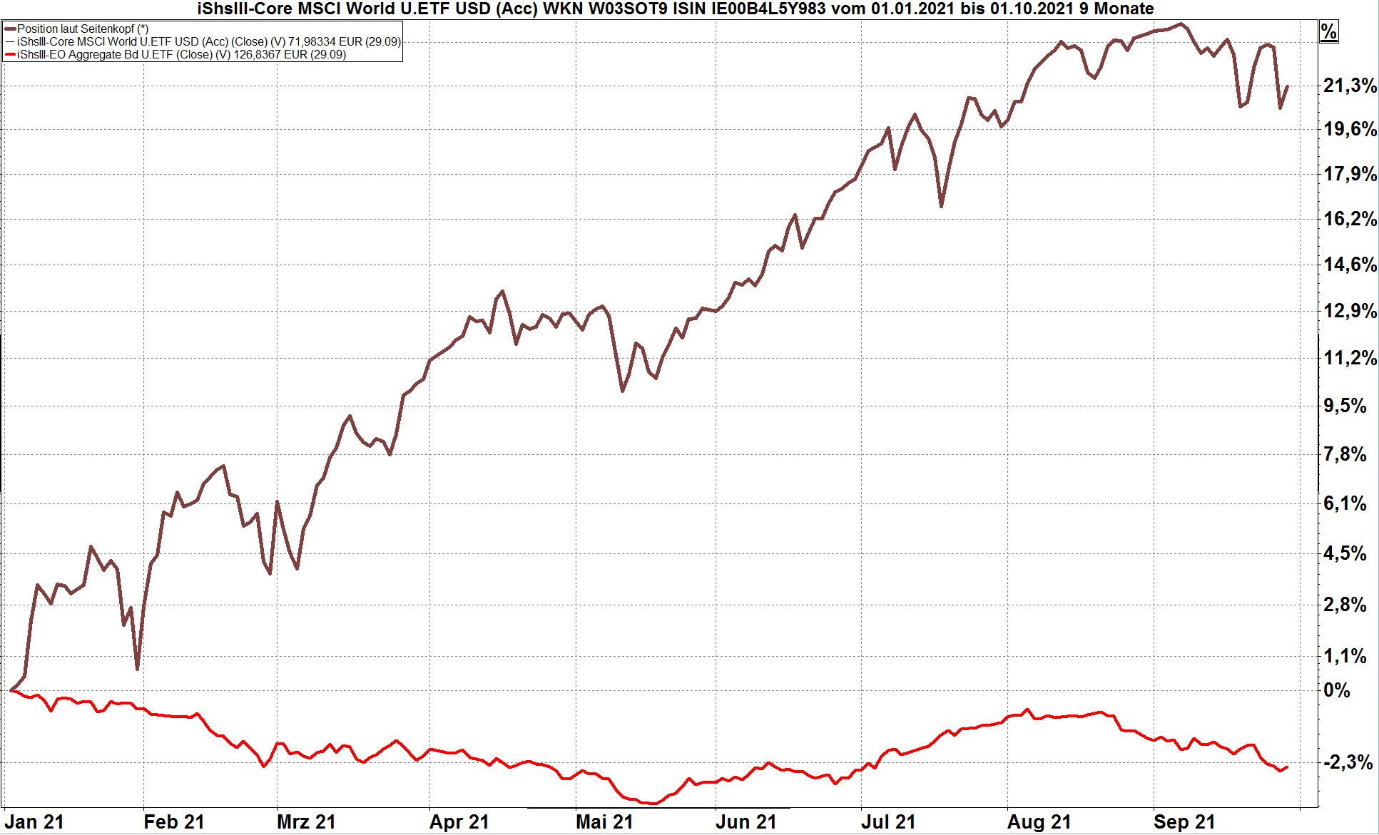 Die folgende Grafik zeigt den Ihnen schon bekannten Weltaktienindex (braune Linie) von Januar bis September 2021. Die rote Linie zeigt einen ETF, der den EO Aggregate Bond Index abbildet. Dies sind auf Euro lautende Anleihen von Unternehmen und Staaten mit unterschiedlichen Laufzeiten.