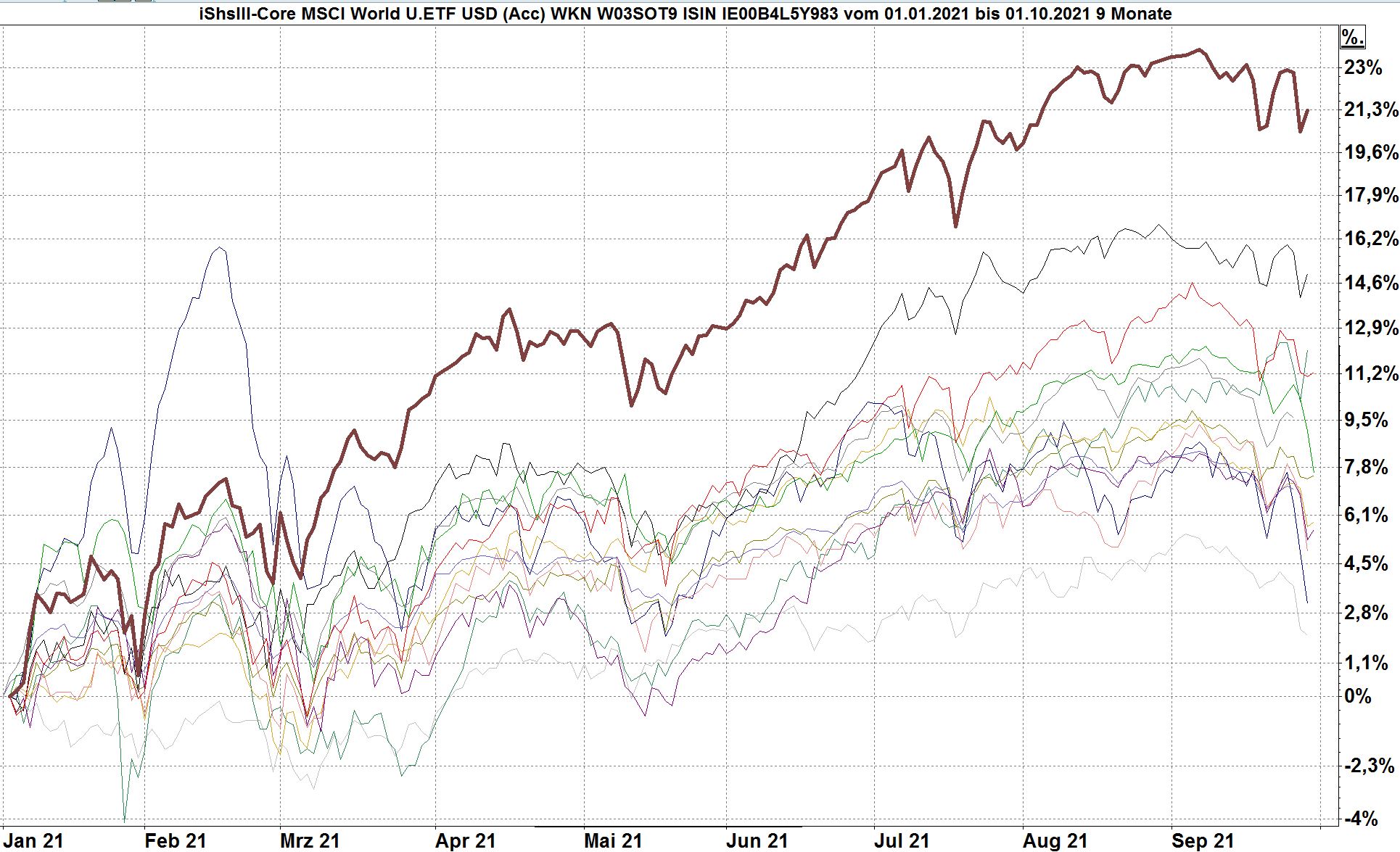 Anfang September erreichten die Aktienmärkte einen vorläufigen Höhepunkt. Der Weltaktienindex hatte seit Jahresbeginn bis zum 7.9. einen Wertzuwachs von über 24 % erreicht. Auch der ETF der UBS, der sich auf „socially responsible“ Titel fokussiert, hatte bis zum 7.9. einen Wertzuwachs von über 23 % erreicht.