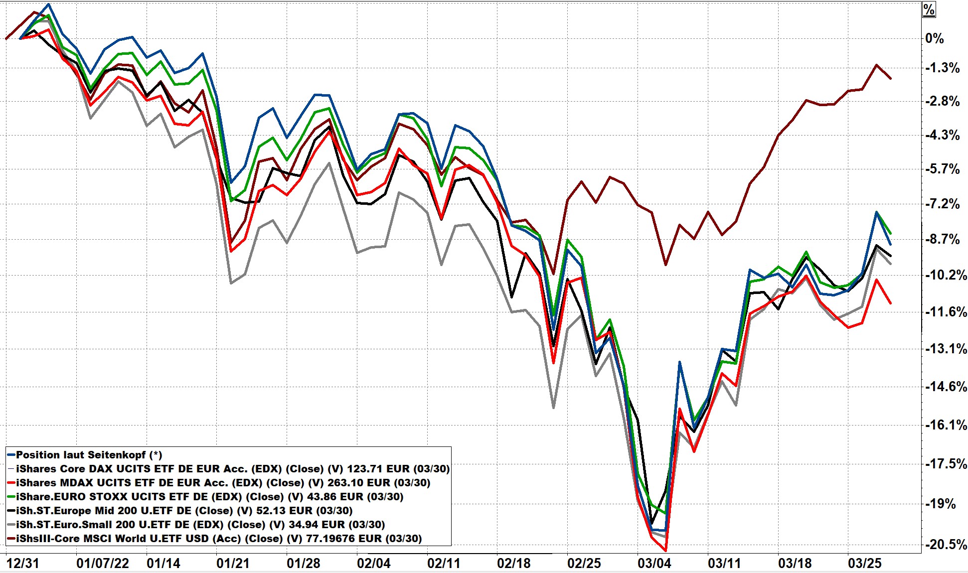 Chart: Europäische Aktienmärkte im ersten Quartal 2022: Im Gleichklang 20 % abwärts bis Anfang März, dann eine Erholung. Bewertung zum 30.03. 10 % unter Jahresbeginn.