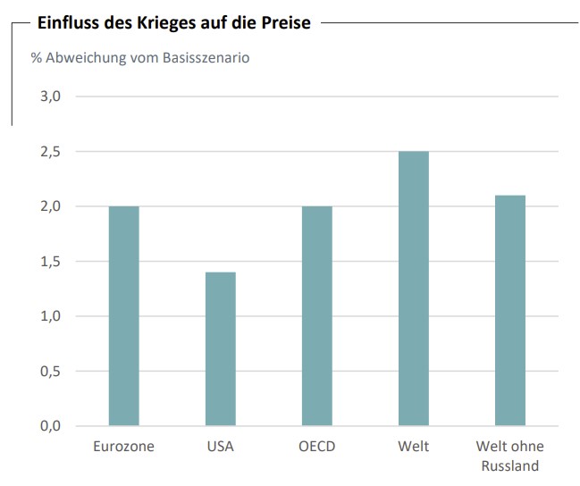 Capital Economics prognostiziert, dass die Auswirkungen des Krieges das globale Wirtschaftswachstum in 2022 um 0,5 % (im Verhältnis zur vorher schon reduzierten Prognose) abschwächen wird. Die USA wachsen nur noch um 3,1 %, die Eurozone um nur noch 2,8 %.