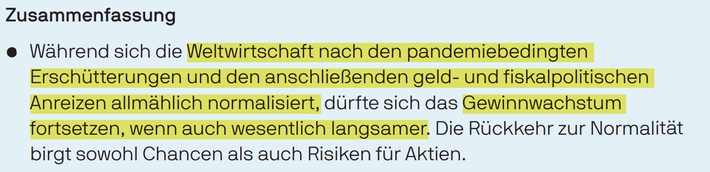 Bis Ende 2023 prognostizieren alle Marktteilnehmer ein weiteres Wachstum der Wirtschaft, jedoch langsamer als in den letzten zehn Jahren. Die Gewinne der Unternehmen werden auch künftig zulegen und zu einer höheren Bewertung der Aktienkurse führen, jedoch nicht mehr so rasant wie in den letzten Jahren.