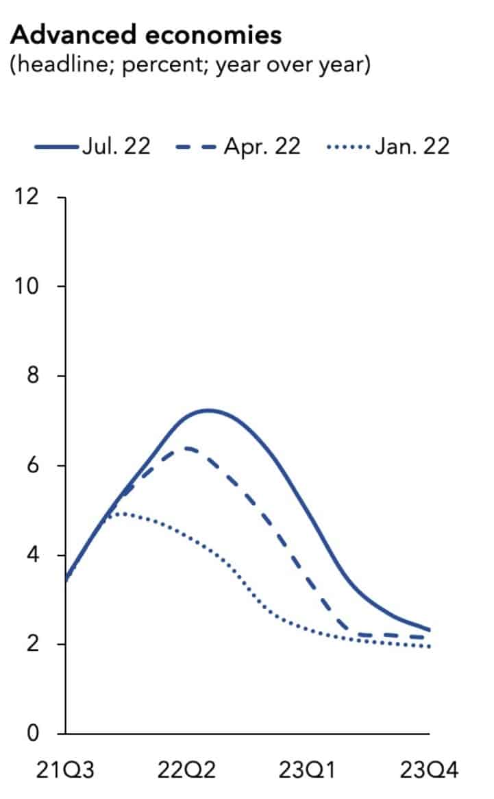 Für die Industrieländer (Advanced Economies = entwickelte Länder) sieht der IMF (International Monetary Fund = Internationaler Währungsfonds) per Juli 2022 den Höhepunkt des Preisauftriebs bereits überschritten. Bis zum vierten Quartal 2023 würde die Inflationsrate wieder bei etwa 2 % liegen.