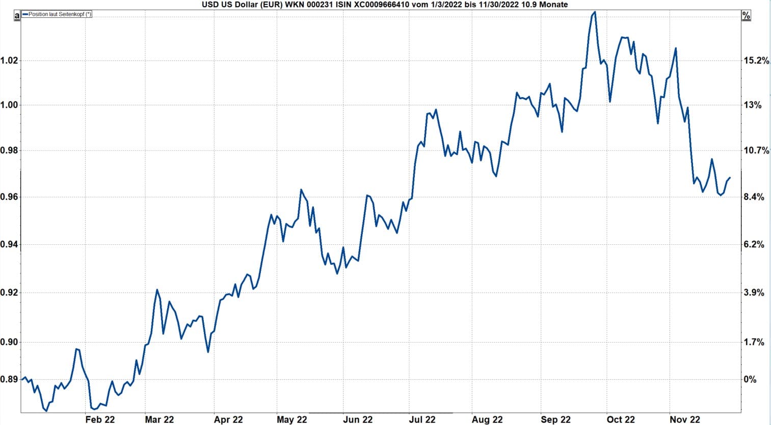 in die vorstehende Darstellung fließt die Veränderung des Wechselkurses zwischen USD und Euro mit ein. Vom Jahresbeginn bis Ende September wertete der USD gegen den Euro um über 17 % auf. Seit dem 27.9. jedoch holte der Euro wieder auf, so dass die Höherbewertung des USD gegen den Euro per 29.11. nur noch 9 % betrug.