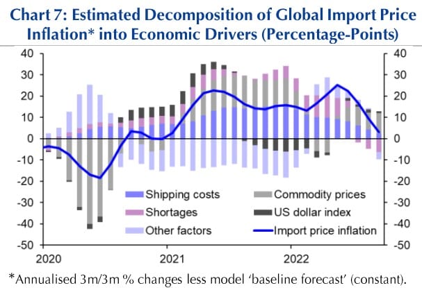 Die Wirkung der „importierten Inflation“ (verursacht durch Steigerungen der Importpreise von Produkten) ging in den letzten Monaten ebenfalls zurück. Von Mitte 2021 bis Mitte 2022 lagen die Importpreise um bis über 20 % höher als Ende 2020. Jedoch gingen mittlerweile fast alle Komponenten, die die Importpreise nach oben getrieben haben, wieder zurück.