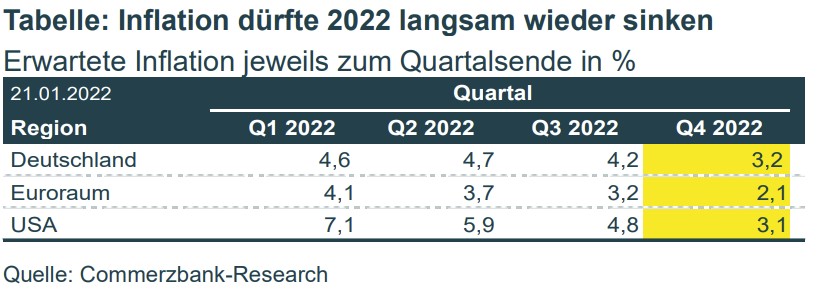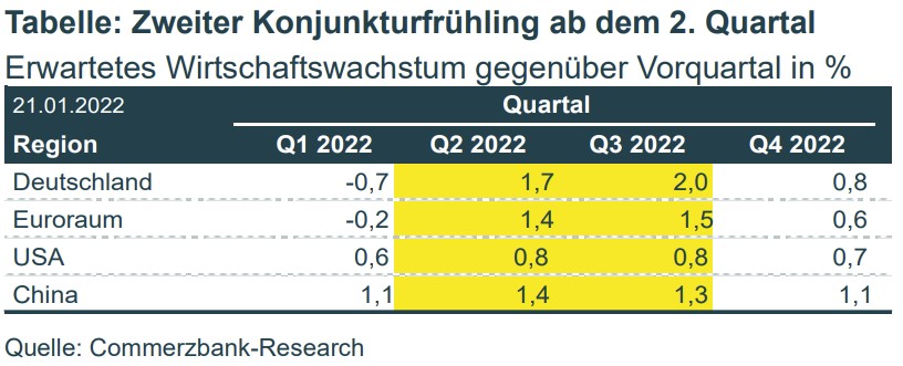 Die Commerzbank veröffentlicht ihre Prognose auf in Quartalszahlen zerlegt und rechnet mit einem schwachen Start in Deutschland und im Euroraum, dann aber mit einer sehr positiven Entwicklung ab dem zweiten Quartal 2022.