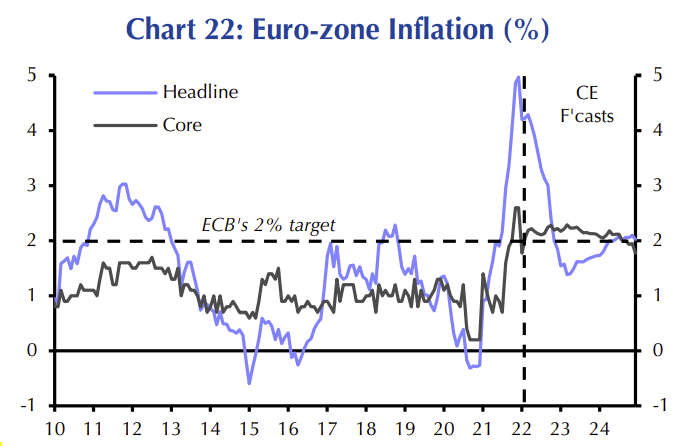 In der Eurozone erleben wir die gleiche Entwicklung. Auch hier wird die Inflationsrate im Jahresverlauf 2022 wieder zurückkommen und sich dann auf einem Niveau etwa einen Prozentpunkt höher als vor der Pandemie einpendeln.