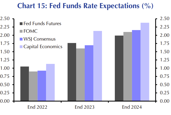 Die folgende Grafik mit Datenstand 25.1.2022 bestätigt diese Erwartungen noch einmal und zeigt auch die leicht abweichenden Prognosen der unterschiedlichen Gruppen. Capital Economics als unabhängiges Analysehaus (jeweils die hellblauen Säulen) liegt mit seinen Prognosen etwas über dem Marktkonsens (dunkelblaue Säulen).