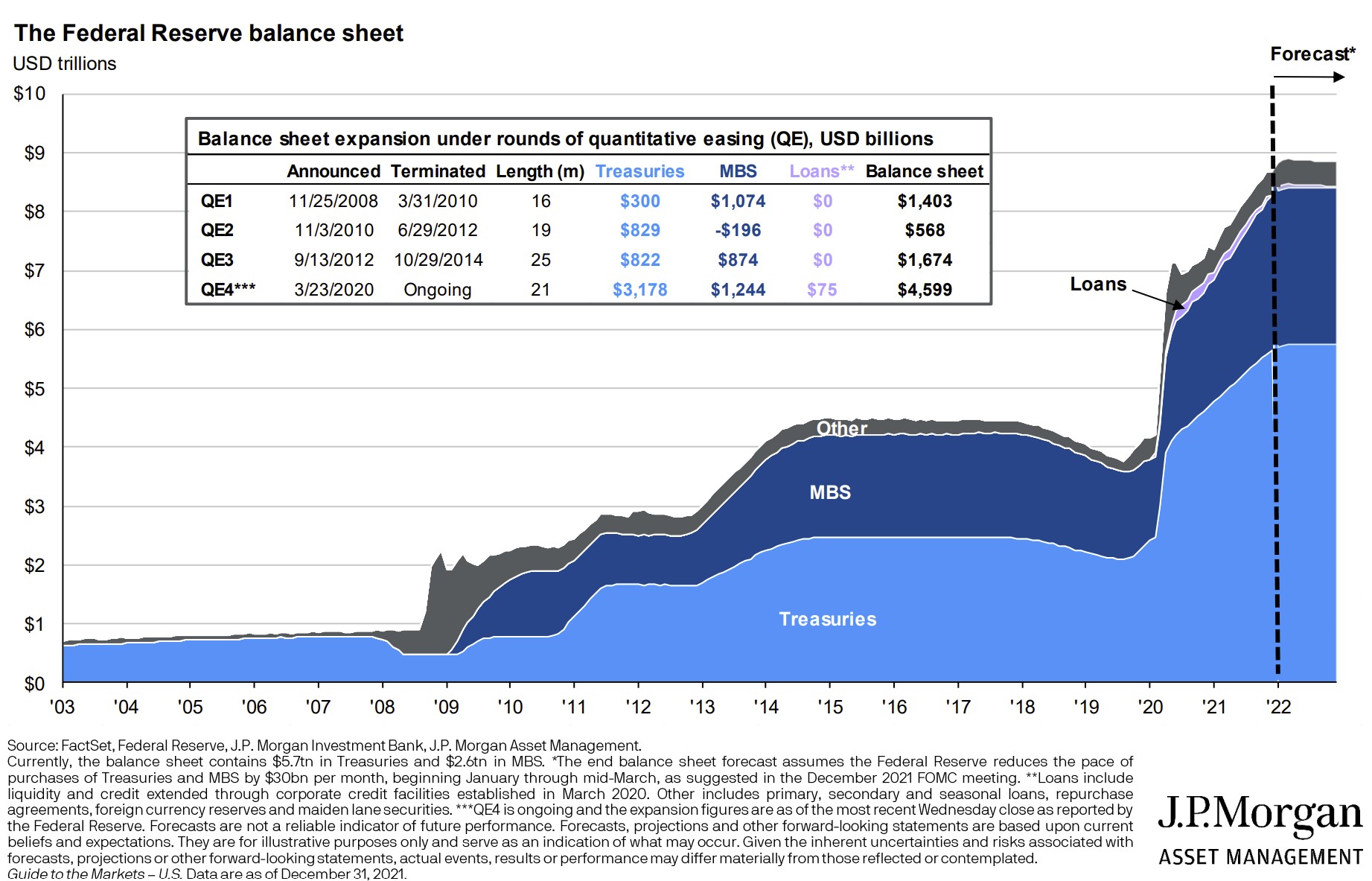 Diese Positionen liegen nun in der Bilanz der Fed und sollen irgendwann mal wieder abgebaut werden. Als ersten Schritt hat die Fed bekanntgegeben, dass der aktuelle noch weiterlaufende Ankauf von Anleihen bis zum März 2022 schrittweise zurückgefahren wird bis auf null.