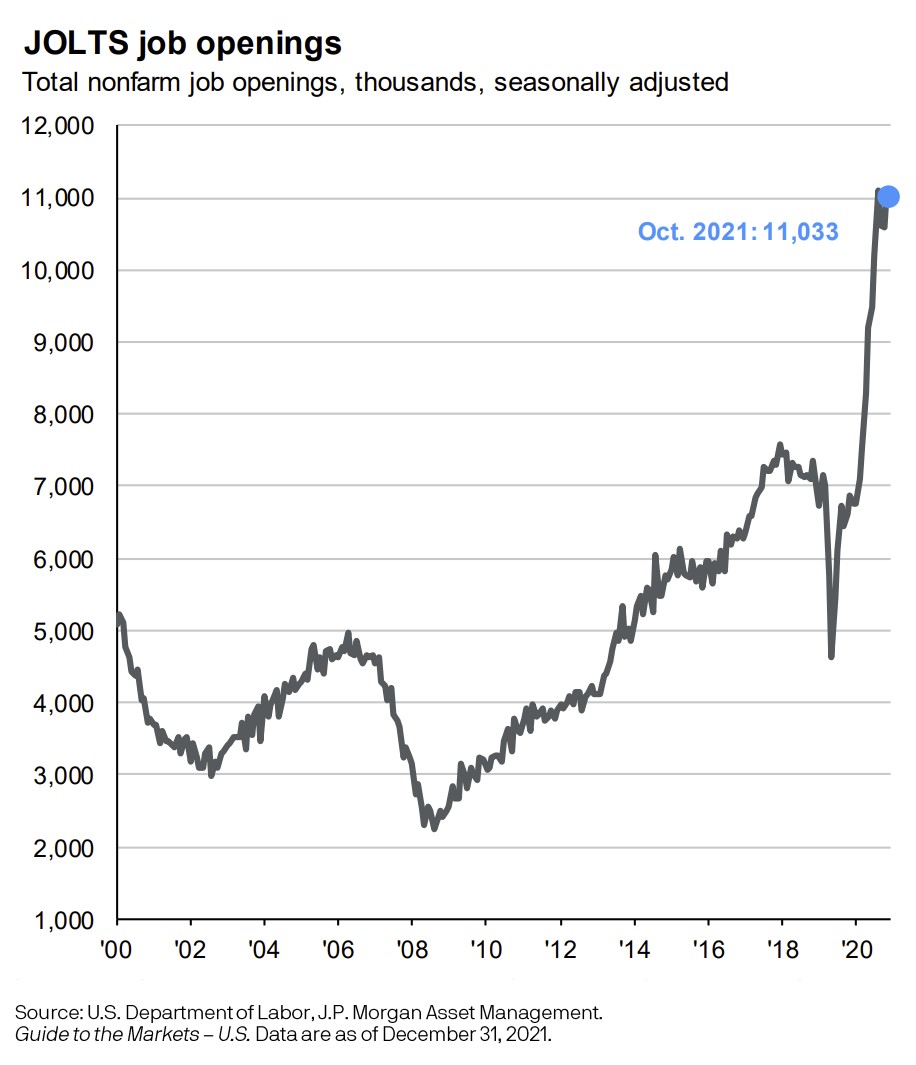 Am Arbeitsmarkt könnten sich allerdings Entwicklungen ergeben, die die Inflation tatsächlich um einen halben bis ganzen Prozentpunkt nach oben bringen. Die folgende Grafik über die offenen Stellen in den USA zeigt deren Entwicklung seit dem Jahr 2000.