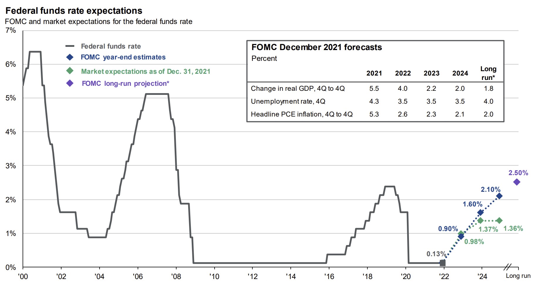Die folgende Grafik zeigt die Entwicklung der Leitzinsen in den USA von Beginn des Jahres 2000 bis Ende 2021 sowie die weiteren Erwartungen für 2022 bis 2024.