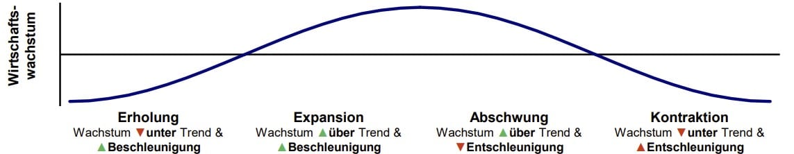 Langfristig wiederholen sich – mit unterschiedlicher Dauer – stets die gleichen vier Wirtschaftszyklen:
