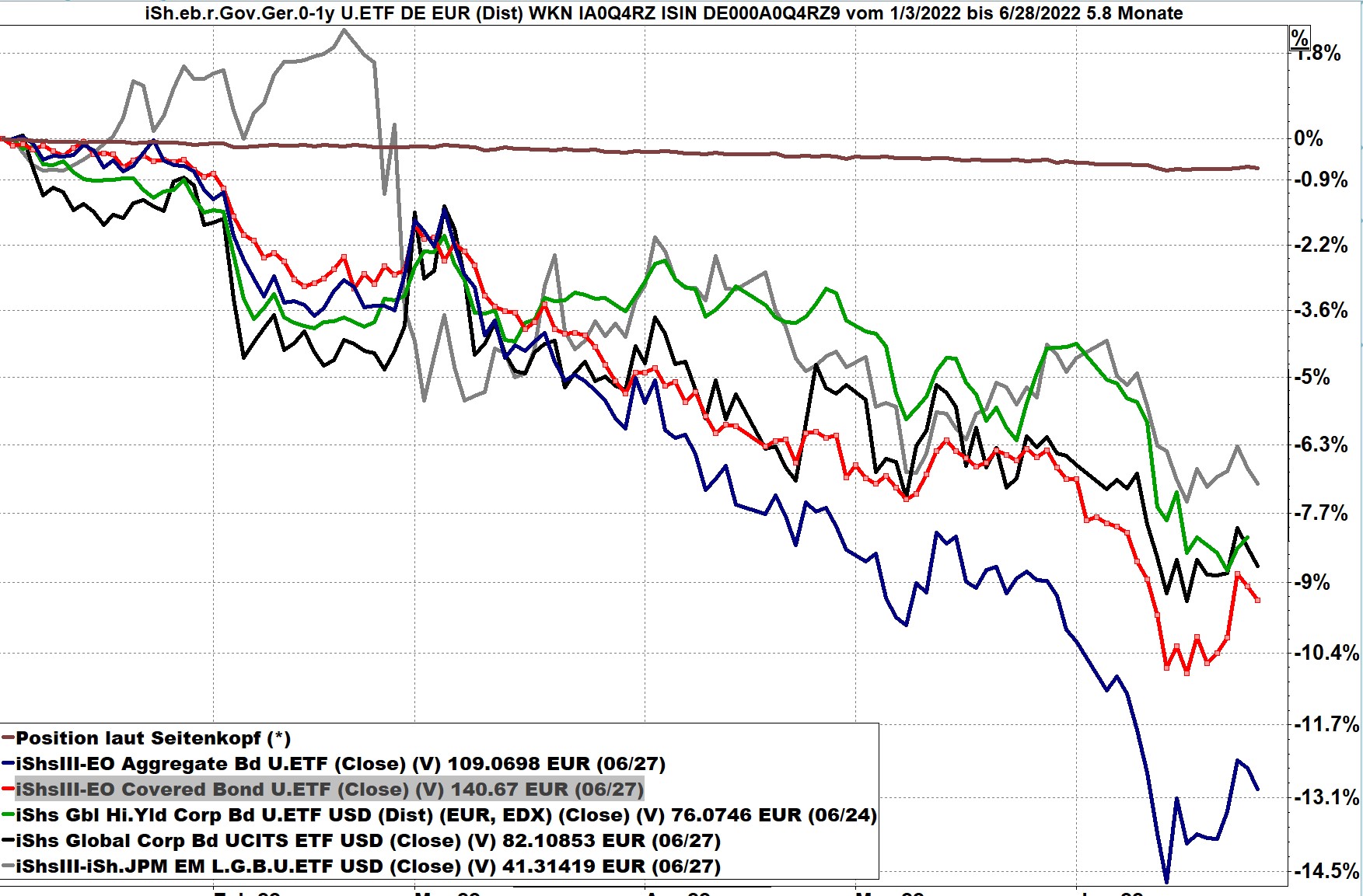 Ein Ausweichen in Anleihen war somit nicht zielführend, mit Ausnahme eines Investments in die Staatsanleihen Deutschland mit extrem kurzer Restlaufzeit. Die kurze Restlaufzeit vermeidet Kursverluste. Sie erkennen dies an der braunen Linie, die die Wertentwicklung dieses Anleihesegments seit Jahresbeginn darstellt. Diese Position kann auch weiterhin als Parkposition für Vermögenswerte genutzt werden, die in den kommenden Wochen und Monaten keinen wesentlichen Wertschwankungen unterliegen sollen.