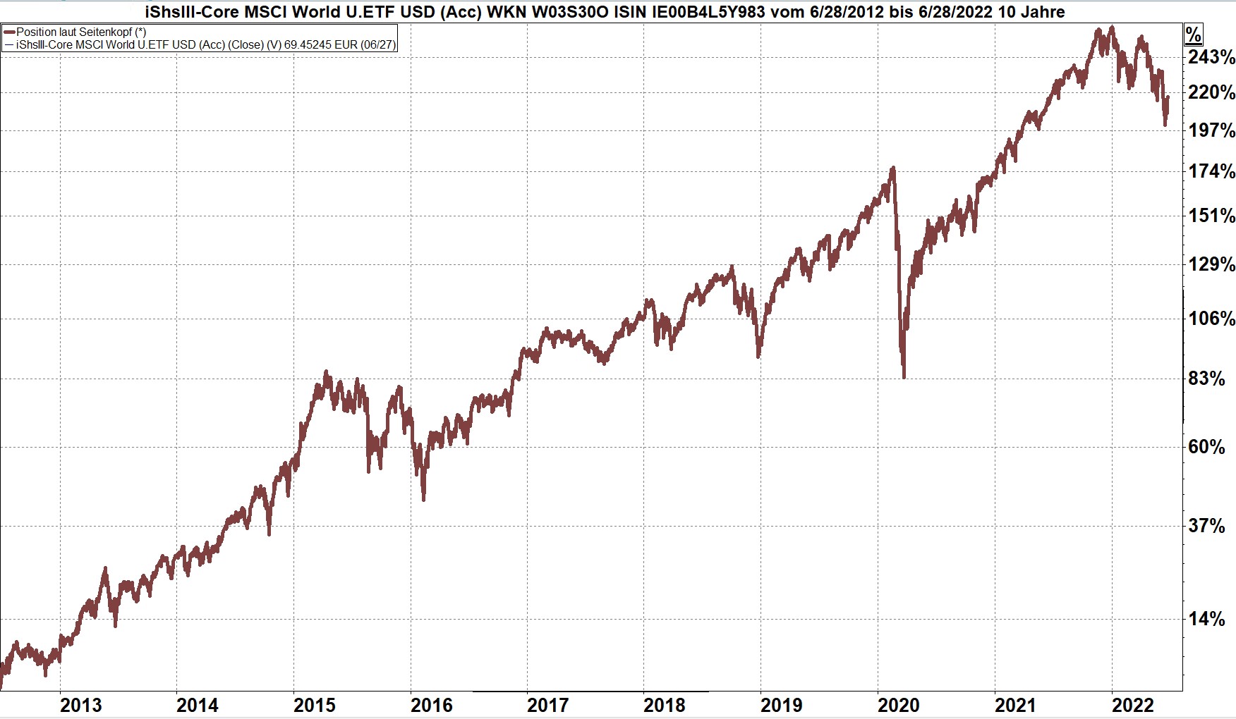Die folgende Grafik zeigt das Ergebnis eines Investments in einen ETF auf den Weltaktienindex, das vor genau zehn Jahren begonnen und bis heute unverändert aufrechterhalten wurde. Eine Einmalanlage von Euro 100.000 wuchs um 220 % und steht damit jetzt auf Euro 320.000.