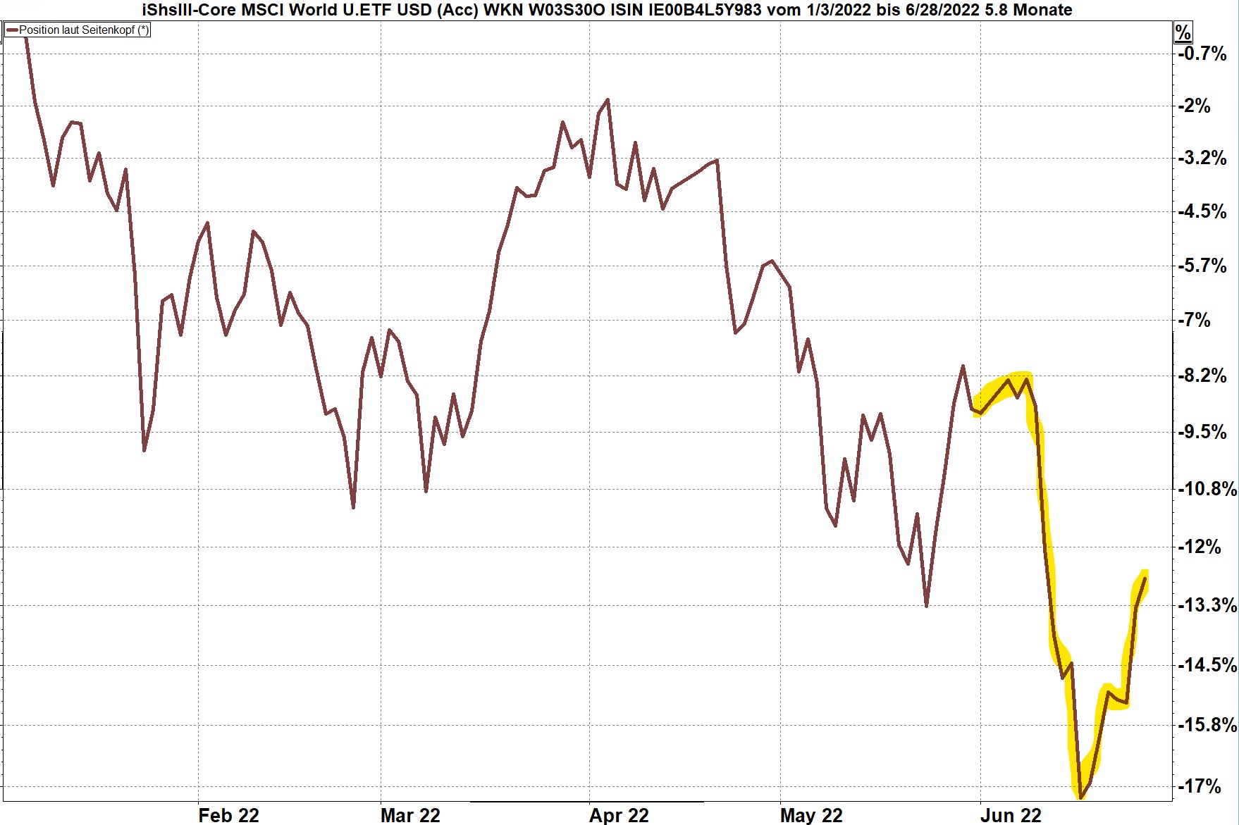 Auch im Juni gingen die Bewertungen der Aktienmärkte weiter zurück. Die folgende Grafik zeigt die Entwicklung des Weltaktienindex mit seinen über 1.500 Positionen aus 23 Industrieländern seit Jahresbeginn 2022. Am 16. Juni erreichten der Index einen Tiefpunkt. Sieben Börsentage später, am 27.06., stand der Index dann wieder 5 % höher bei minus 12,5 %.