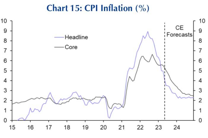In den USA hat die Inflation ihren Höchstpunkt hinter sich. Bis Ende 2024 wird ein weiterer Rückgang bis unter 3 % erwartet. Die Grafik zeigt die Entwicklung des CPI (Consumer Prise Index = Inflationsrate) in den zwei üblichen Varianten von 2015 bis zum Mai 2023 und die Erwartungen bis 2025.