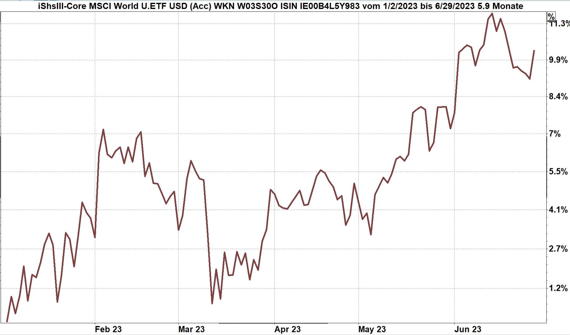 Chart: Weltaktienindex, dargestellt über einen ETF von iShares, vom 1.1. bis 28.06.2023, Bewertung in Euro.