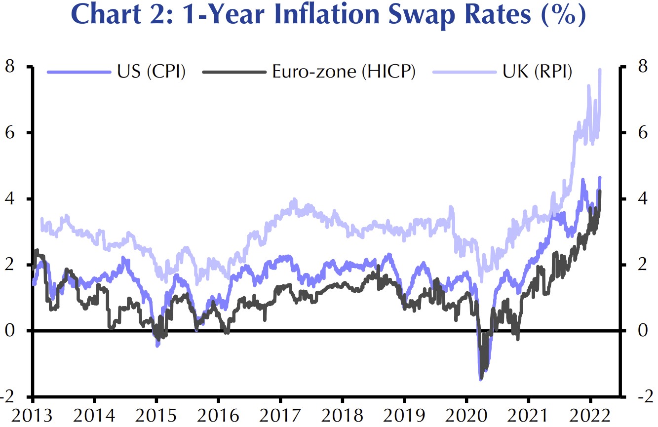 „… Viertens sind die Risiken für die Märkte der Eurozone ein wenig anders als für die Märkte in anderen Ländern. Die Auswirkungen auf das Wirtschaftswachstum werden in der Eurozone wahrscheinlich größer sein als in den meisten anderen Ländern, vor allem, wenn strengere Sanktionen, die auf Russlands Energieexporte abzielen, in Kraft treten. Auch der Inflationsschub könnte stärker ausfallen. Aber die langfristigen Inflationsentwicklungen sind in der Eurozone viel besser unter Kontrolle als in den meisten anderen entwickelten Ländern. In der Tat sind sie wohl immer noch unter dem Niveau, das mit dem Erreichen des Inflationsziels der Zentralbank vereinbar ist. (siehe Chart 6: 5-Year Forward Inflation Swap Rates.)
