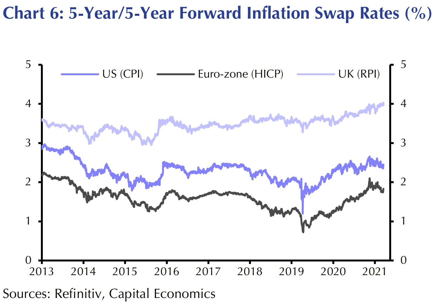 In den USA haben sich die Inflationserwartungen für die nächsten fünf Jahre nur geringfügig erhöht. In der Eurozone liegen die Erwartungen heute höher als 2019, jedoch immer noch unter 2 %.