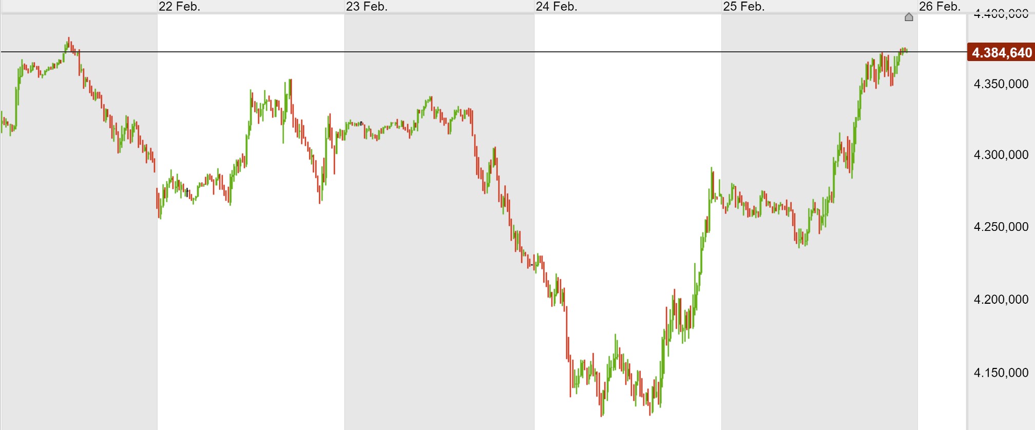 Weniger als 24 Stunden nach Beginn des Rückgangs, als sich zahlreiche Investoren eine Meinung darüber gebildet hatten, welche Auswirkungen die Invasion in der Ukraine haben könnte, lag der Kurs des Index wieder auf den vorigen Stand, ja sogar ein bisschen darüber. Diese Entwicklung erzählt uns: